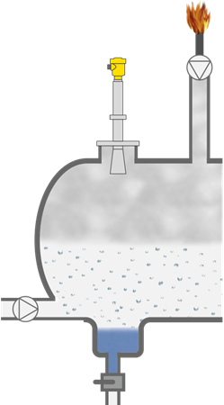 Los residuos gaseosos no recuperables de la extracción del petróleo y el gas se acumulan en el depósito de separación (knockout drum) y se licuan con presiones de hasta +100 bar. El líquido obtenido, el condensado, se acumula al fondo del depósito y se elimina. Los gases no licuados se descomprimen y se queman en el quemador. Para un funcionamiento eficiente y seguro, se debe medir el nivel de forma fiable.